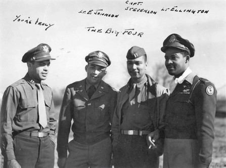 The next day, the 332nd began flying hundreds of missions combining long range bomber escort sorties and short range strafing sorties against enemy targets in Italy, Germany, Austria and elsewhere. On July 9, they flew an escort mission protecting B-24s attacking the massive oil refinery at Ploesti, Rumania, one of the most important bombing missions of the war. That raid was led by Major Paul Tibbets and his bombardier, Tom Ferebee, of Davie County, NC. Tibbets and Ferebee would later be the pilot/bombardier combination on the Enola Gay which dropped the first atomic bomb on Hiroshima.